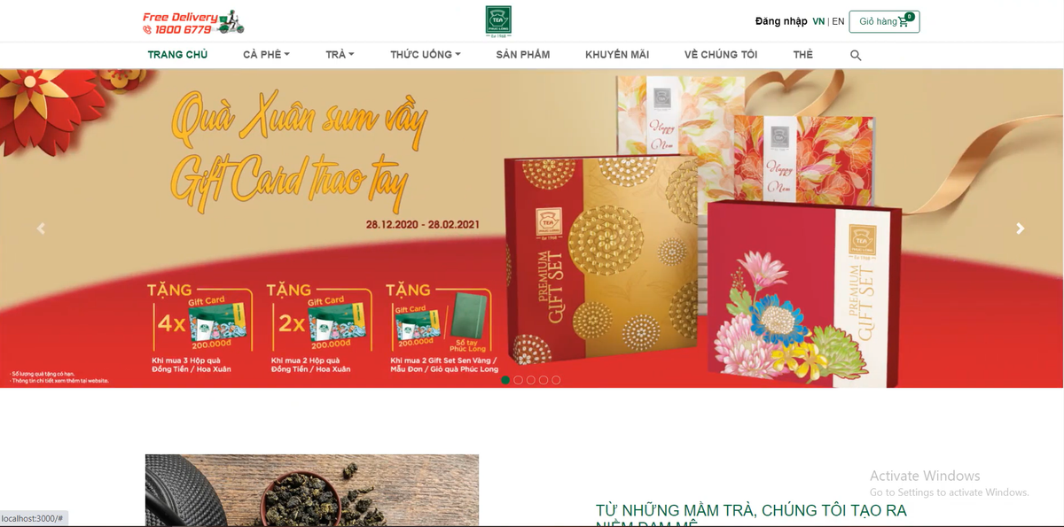 Trang web Phuc Long với các chức năng xem sảm phẩm, thông tin, đặt hàng,...